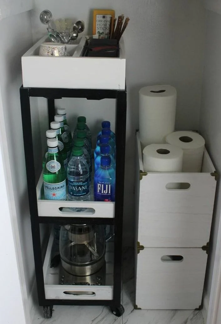 Although this is technically extra space it's still small. So finding the right systems to create the dream tea and coffee bar would still be challenging. The measurements of every single item used had to be exact. If you will be attempting something like this in your home, be sure to download the WHO Worksheet (available when you subscribe) to drastically reduce the amount of time spent looking for the perfect items for your pantry.
