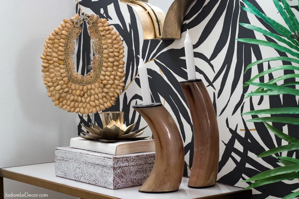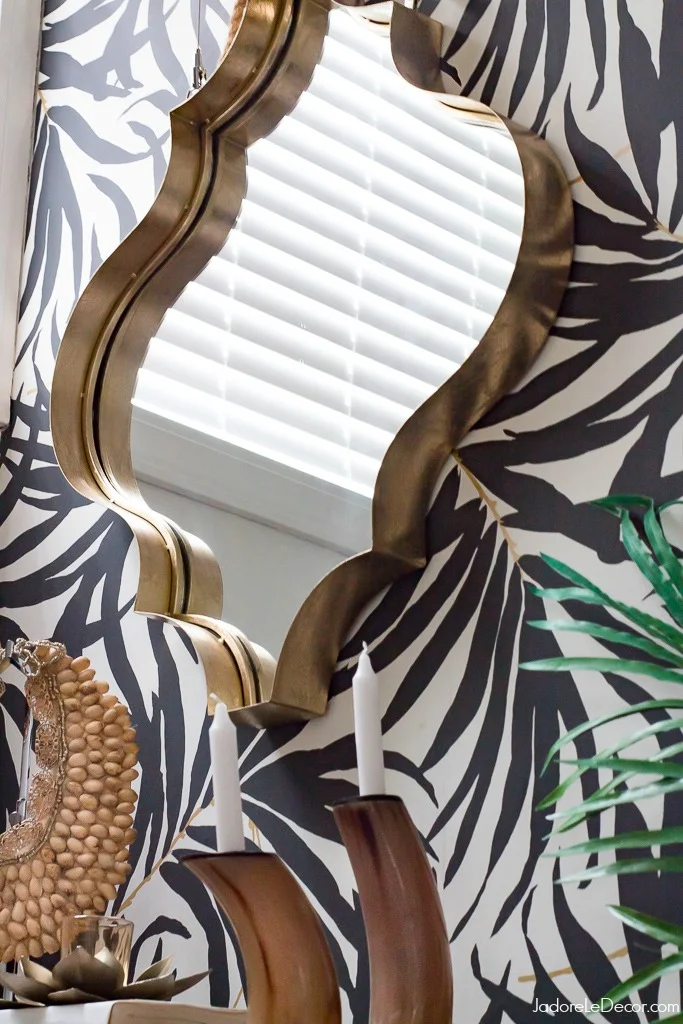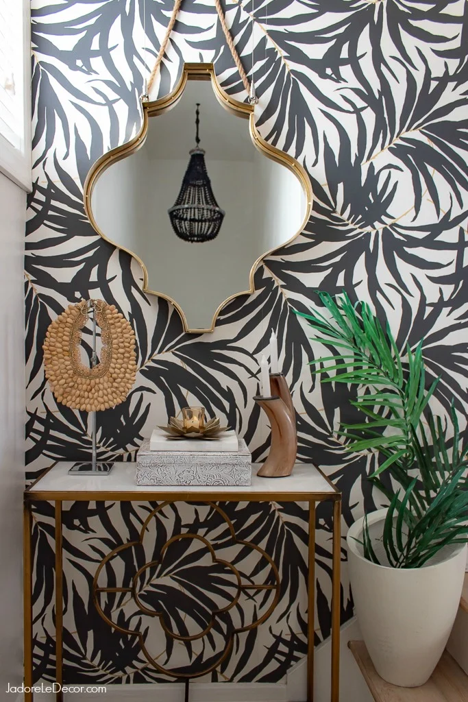 Indeed there is something to be said about choosing great foundation pieces during a renovation. They allow a homeowner a ton of flexibility when changing the decor. The wallpaper I chose for this space had been on my wishlist for at least a year or more. Its tropical bohemian vibe could not have been a more perfect choice.