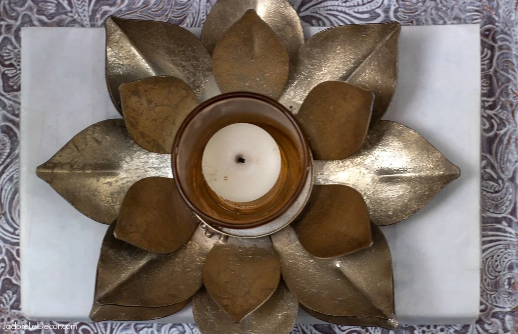This impactful change was achieved by simply, swapping out the heavy winter-like accessories with more airy ones. The total cost was less than $20 for the white ceramic vase and the gold lotus candle.