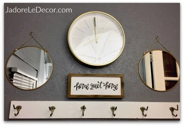 Every item on my wish list has now been addressed. The signage ($7 from Hobby Lobby) provides a warm welcome home. There's an analog clock which is surprisingly refreshing to see ($19, Target), and a place for umbrellas ($4.99 Burlington). We also have a place for those last minute hair, makeup and tie adjustments before heading out the door ($5, Target dollar section). And as you can see, the shoes - even for the the Mister - fit comfortably. Mission accomplished!